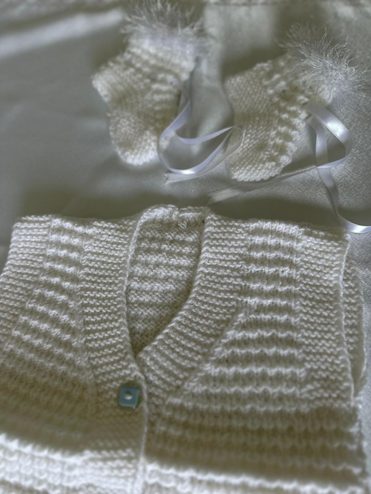 Miniklerin hassas tenine uygun olarak özenle örülen el örgüsü bebek yeleği ve patik seti %100 bebe ipi ile hazırlanmıştır. Yumuşak dokusu, hafifliği ve sıcak tutan yapısı sayesinde hem konforlu hem de şık bir kullanım sunar.