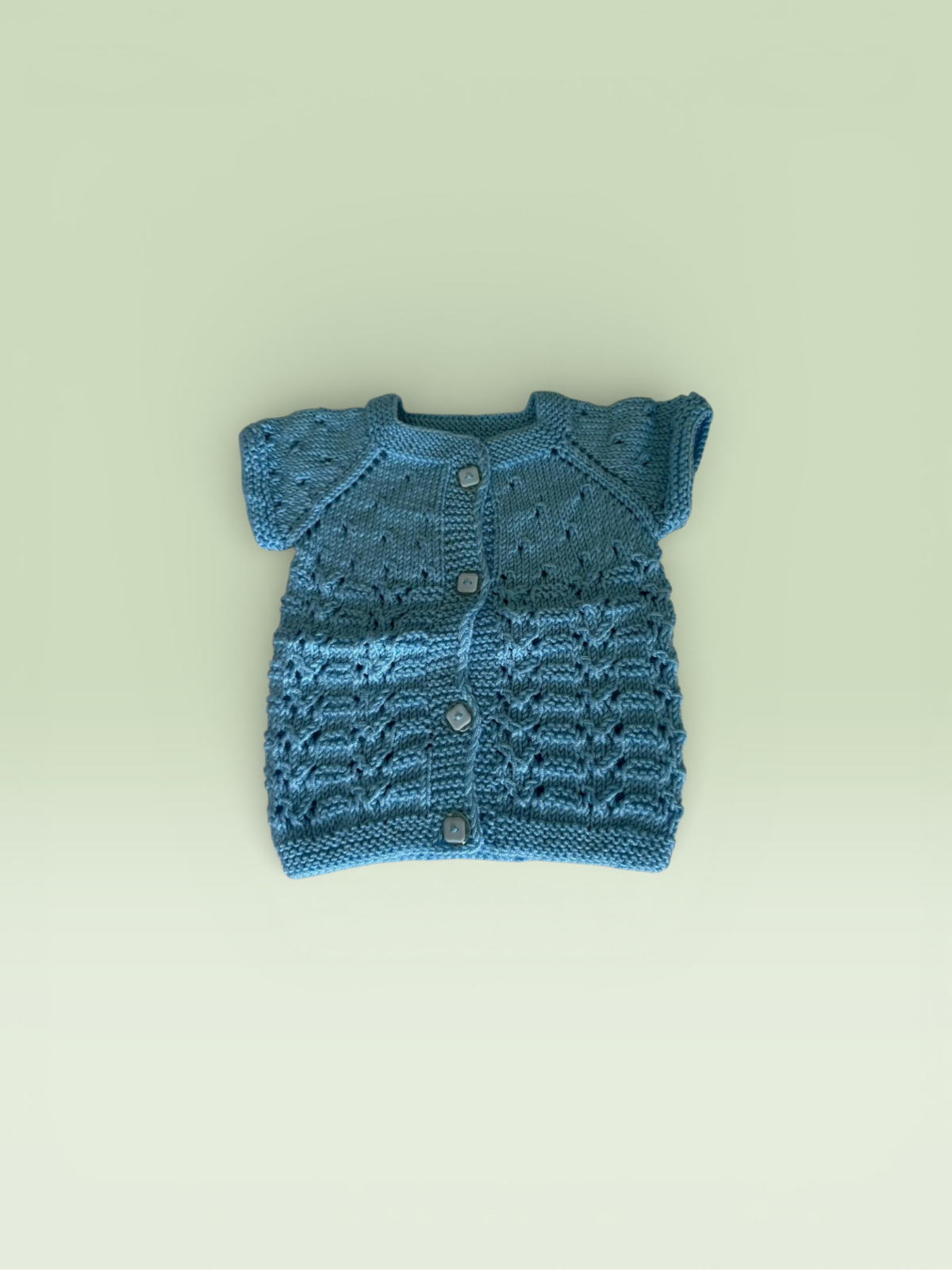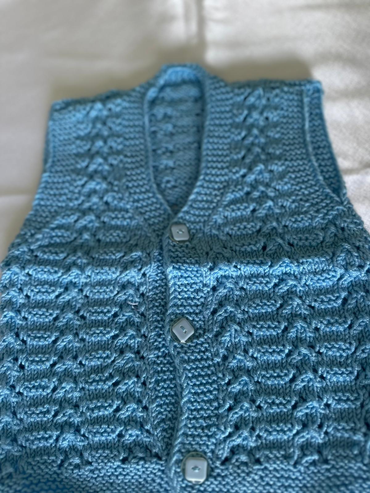Tamamen el emeğiyle hazırlanan yelek, 0 - 1 yaş aralığında bebeklere rahat bir kullannım sunar. Düğmeli tasarımı sayesinde kolay giydirilir, esnek dokusu ile hareket