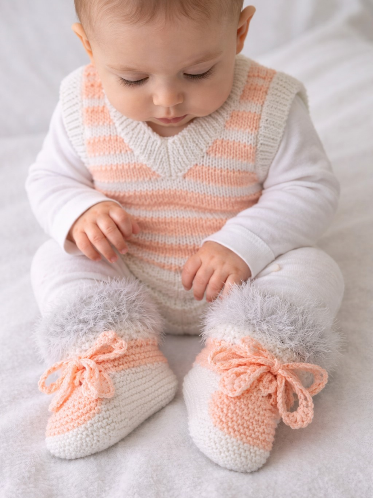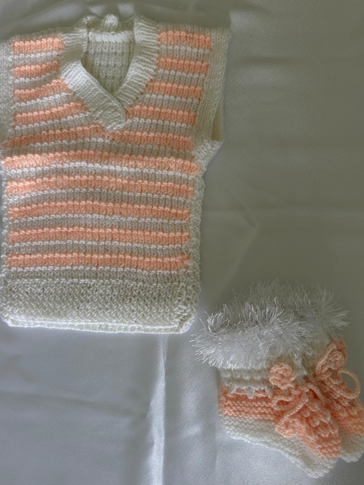 Pembe Beyaz bebek Süeter ve patikten oluşan bebek takımı.