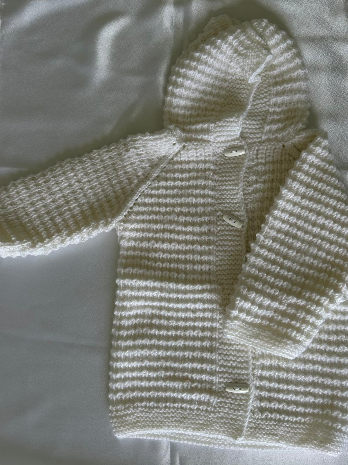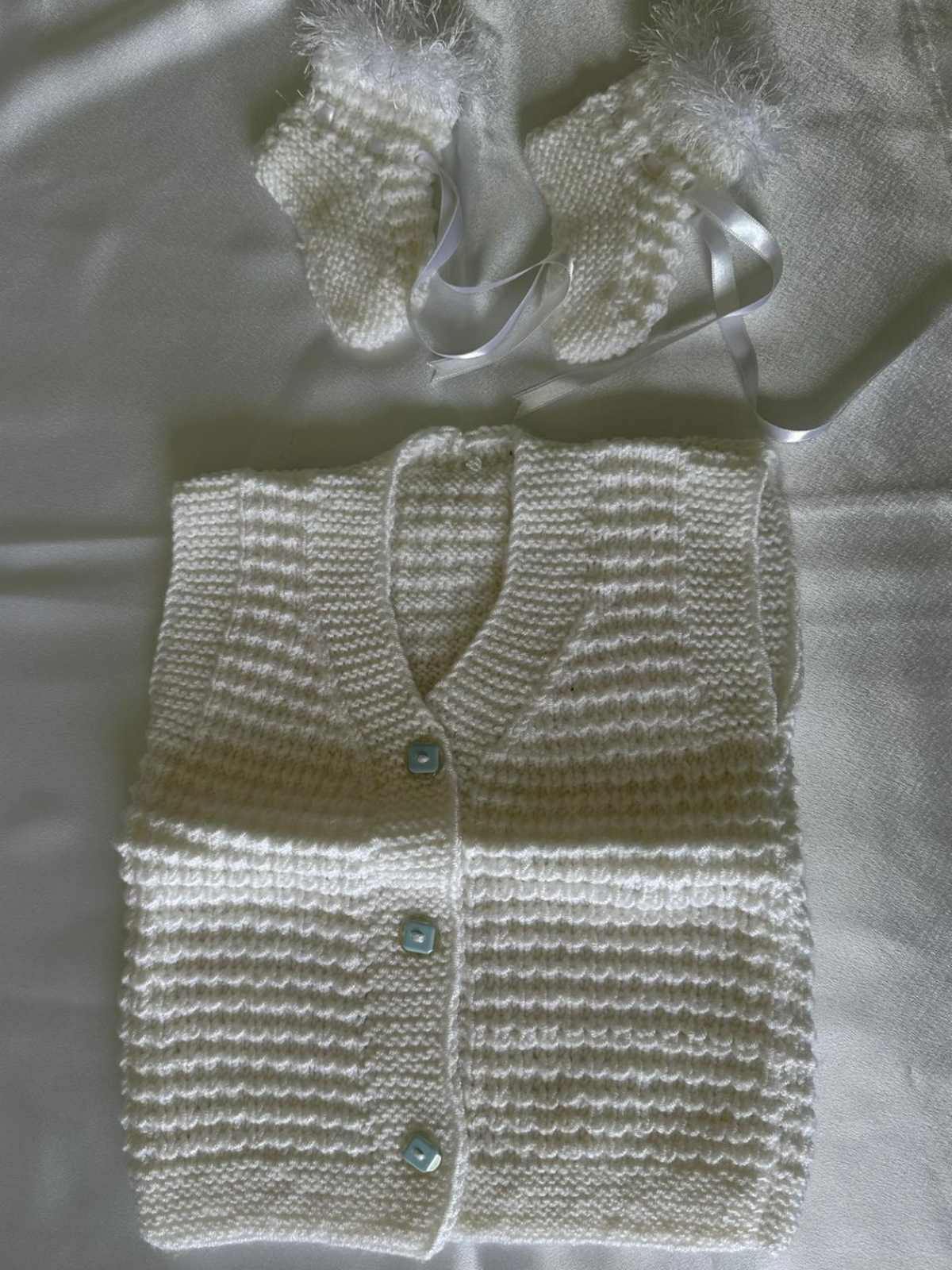 Beyaz El Örgüsü Bebek hırka, Yelek ve patikten oluşan bebek takımı.