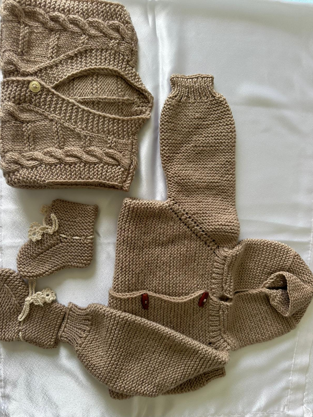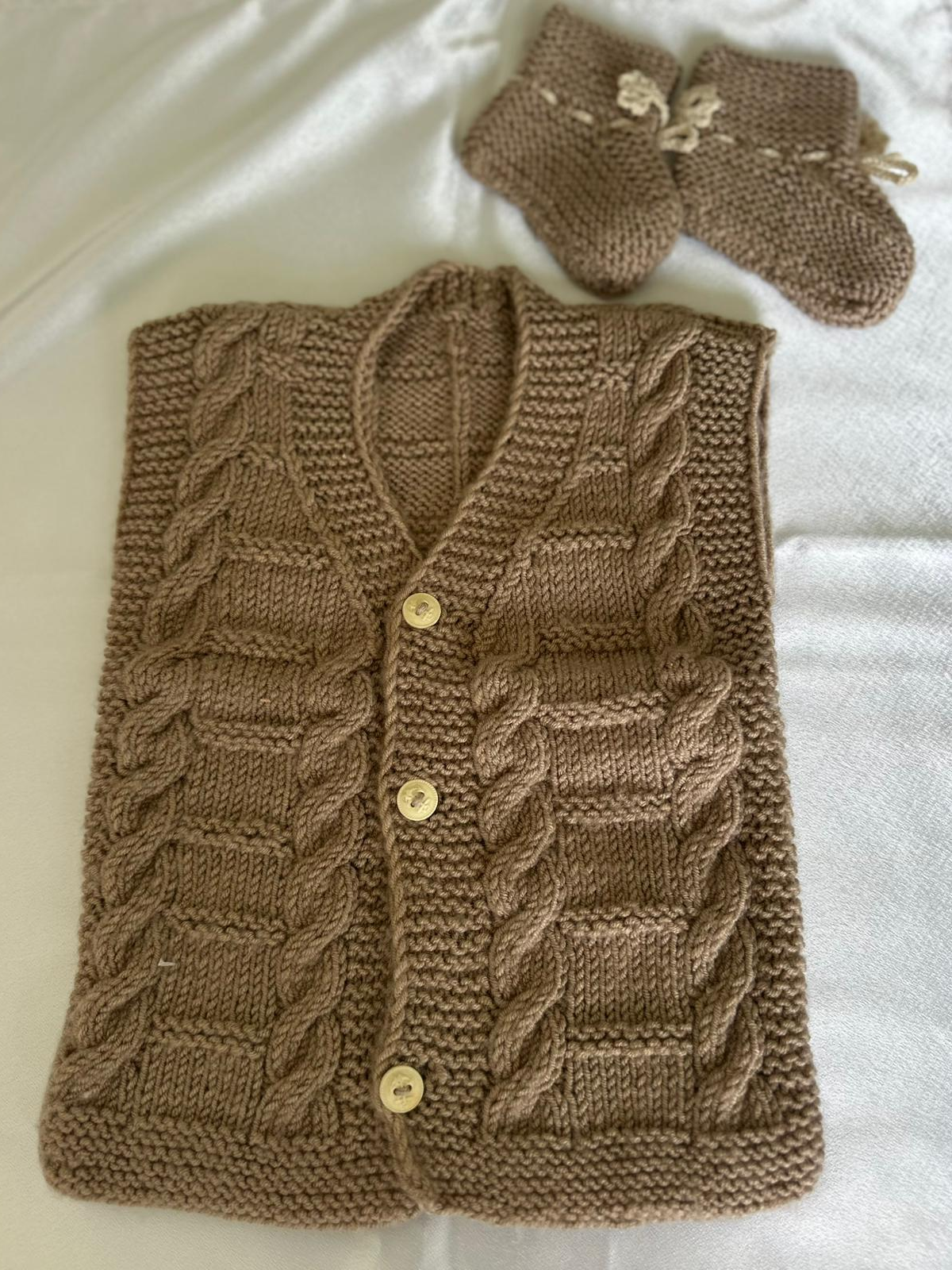 ÜRÜN HAKKINDA:Kahverengi El Örgüsü Bebek hırka, Yelek ve patikten oluşan bebek takımı.