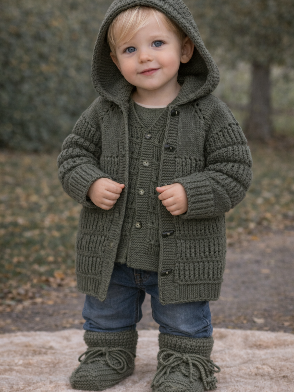 Tamamen el emeğiyle hazırlanan hırka, yelek, süeter, şapka ve patikten oluşan ürünümüz 1-2 yaş aralığında bebeklere rahat bir kullanım sunar. Düğmeli tasarımı sayesinde kolay giydirilir, esnek dokusu ile hareket özgürlüğü sağlar. Her bir ilmeği özenle işlenen bu özel parça, hem günlük kullannımda hem de özel günlerde şık bir tamamlayıcıdır. Doğal ve anti-alerjik ip tercih edilerek üretilmiştir; bebeğinizin tenine nazikçe dokunur.