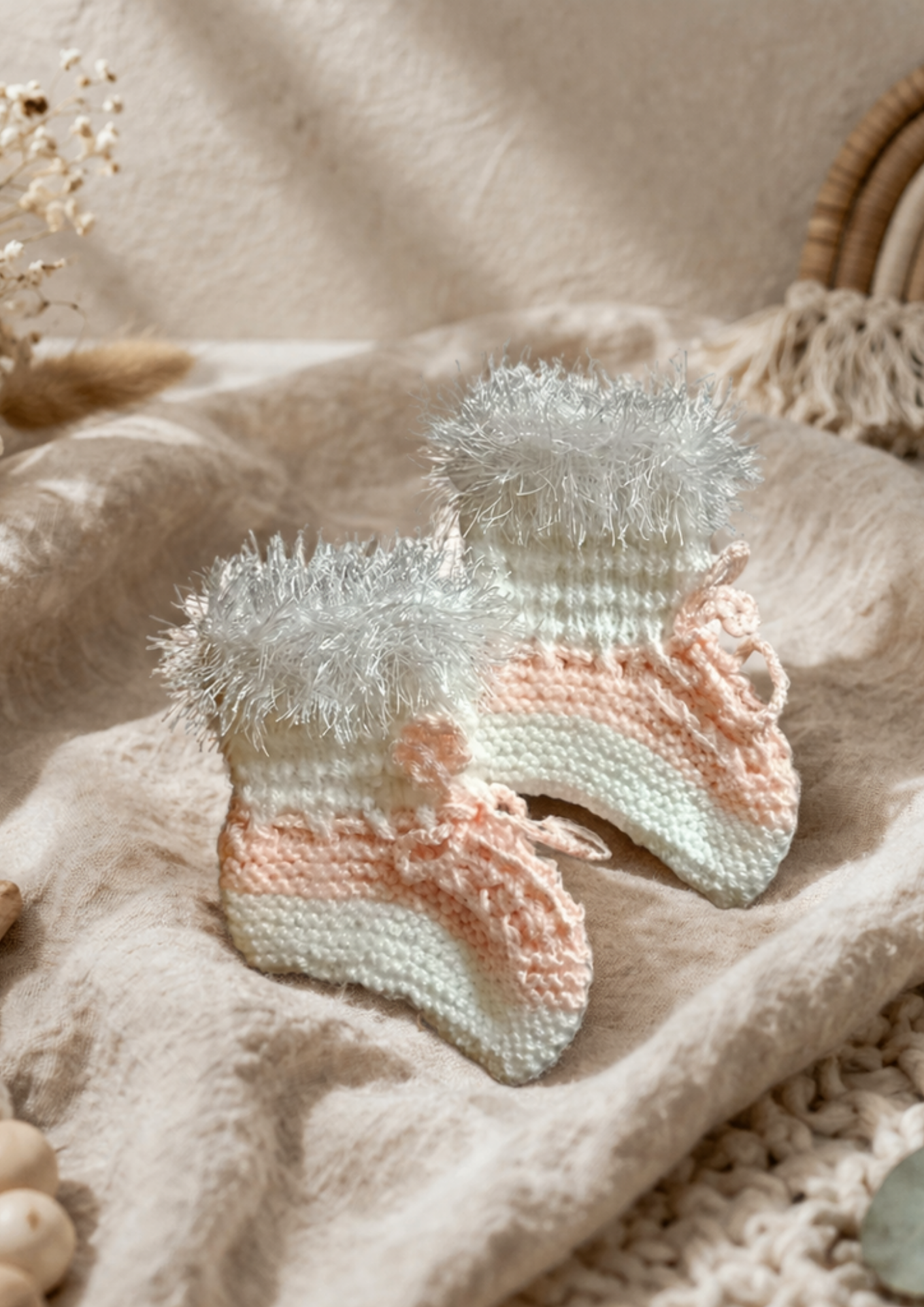 Pastel şeftali ve krem tonlarının uyumuyla hazırlanan bu patikler, hem estetik hem de huzur veren bir görünüm sunar. Üst kısmındaki yumuşak tüylü detay, patiklere sıcacık bir dokunuş kazandırırken; bağcıklı yapısı sayesinde ayağa nazikçe uyum sağlar.