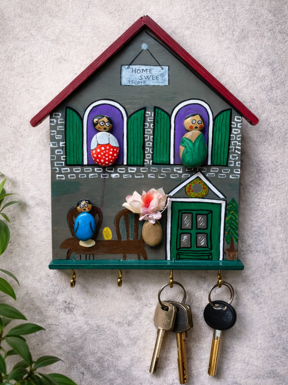 Akrilik boya ile tamamen el boyaması olarak hazırlanan bu dekoratif MDF anahtarlık askısı, ev sıcaklığını ve aile hissini yansıtan özgün bir tasarıma sahiptir. Doğal taşlardan oluşturulmuş figürler, pencere detayları ve “Home Sweet Home” yazısıyla her biri tek ve özel bir karakter taşır.