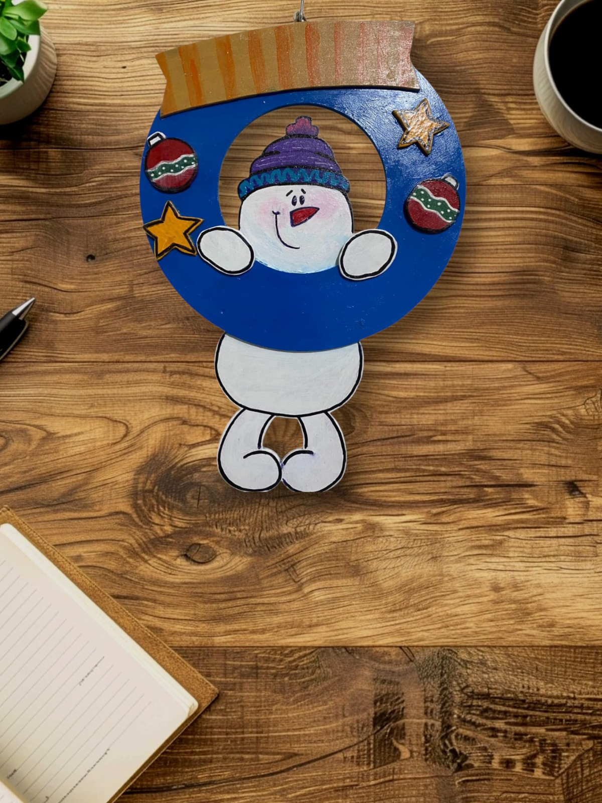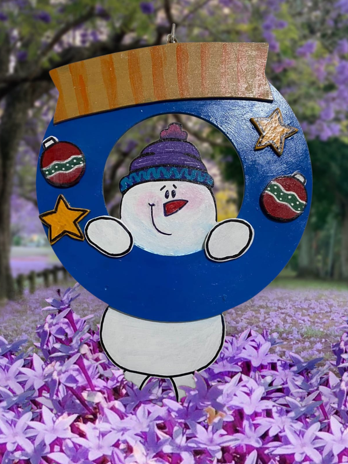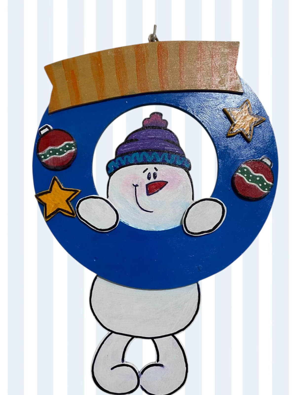 Kapınızı her açtığınızda gülümseten bu sevimli kardan adam kapı süsü, kış mevsiminin neşesini ve yılbaşı sıcaklığını evinize davet eder. Mavi çember formu, kapı üzerinde dengeli ve dikkat çekici bir görünüm sunarken; el boyaması yıldız ve yılbaşı topu detayları tasarıma masalsı bir hava katar.