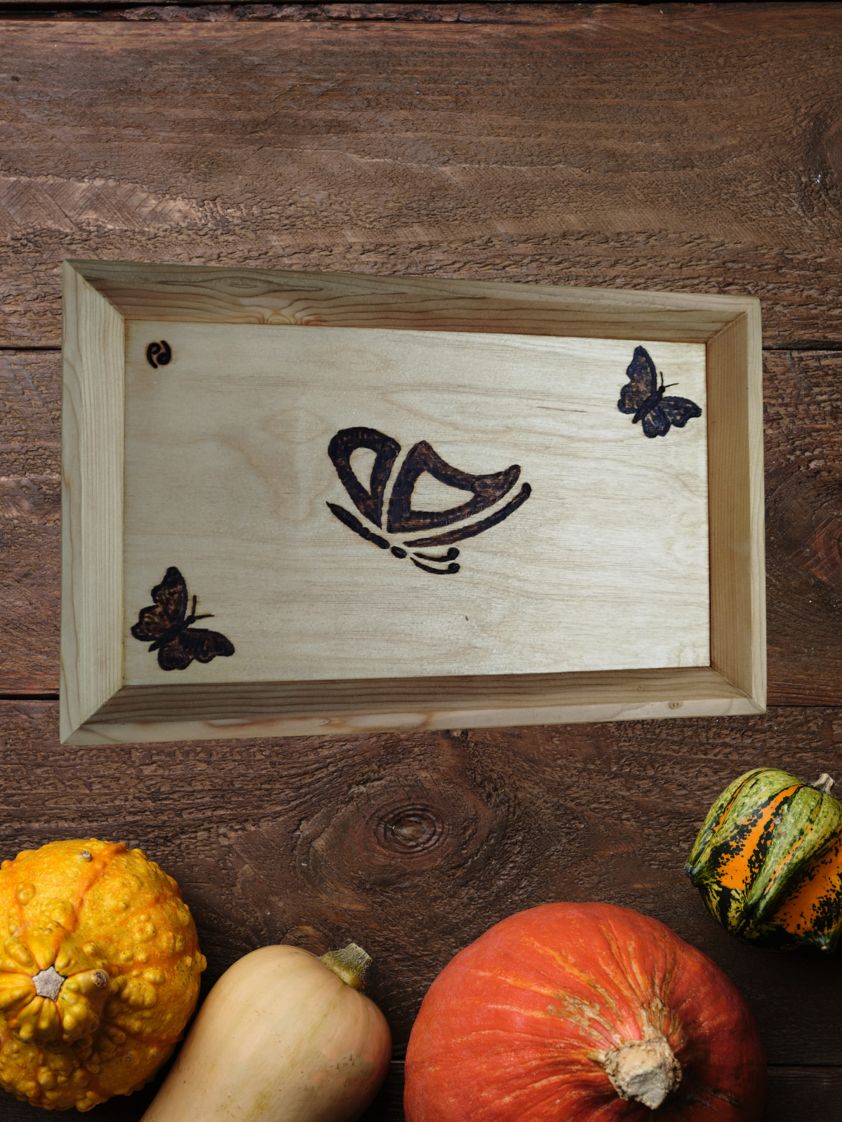 Doğal ahşabın sıcak tonları, kelebek motiflerinin zarif dokunuşuyla birleşerek hem dekoratif hem de fonksiyonel bir kullanım sunar. Sunumlarınızda şıklık katarken, yaşam alanlarınıza da doğal bir atmosfer kazandırır.