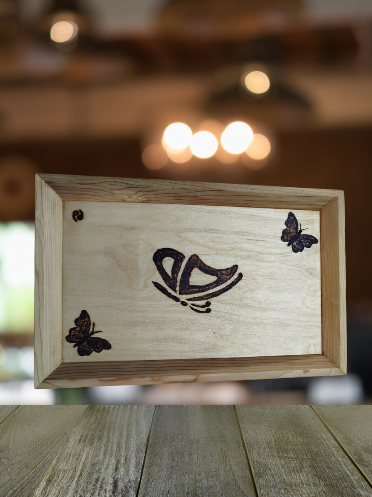 Doğadan ilham alan bu zarif tasarım, sade ahşap yüzey üzerine işlenen kelebek figürleriyle huzur ve estetiği bir araya getiriyor. El işçiliğiyle oluşturulan her detay, ürünün kendine has bir karakter taşımasını sağlar.