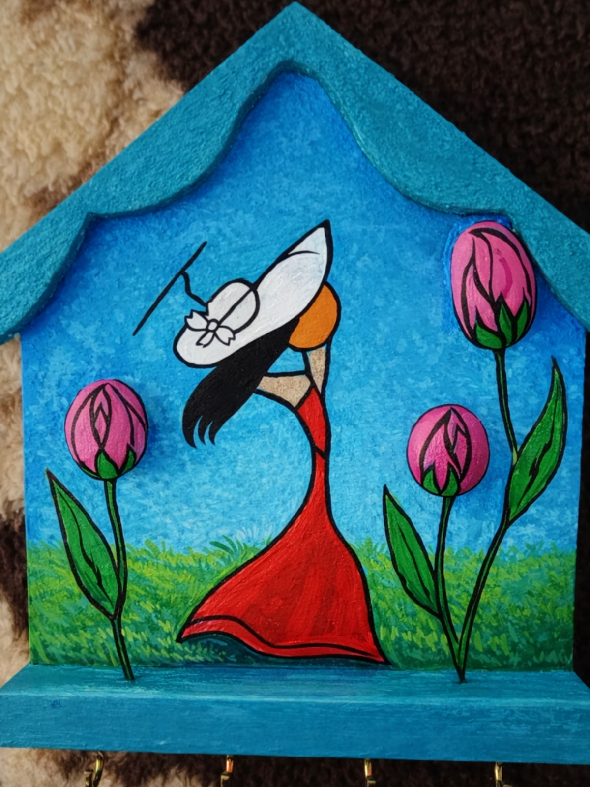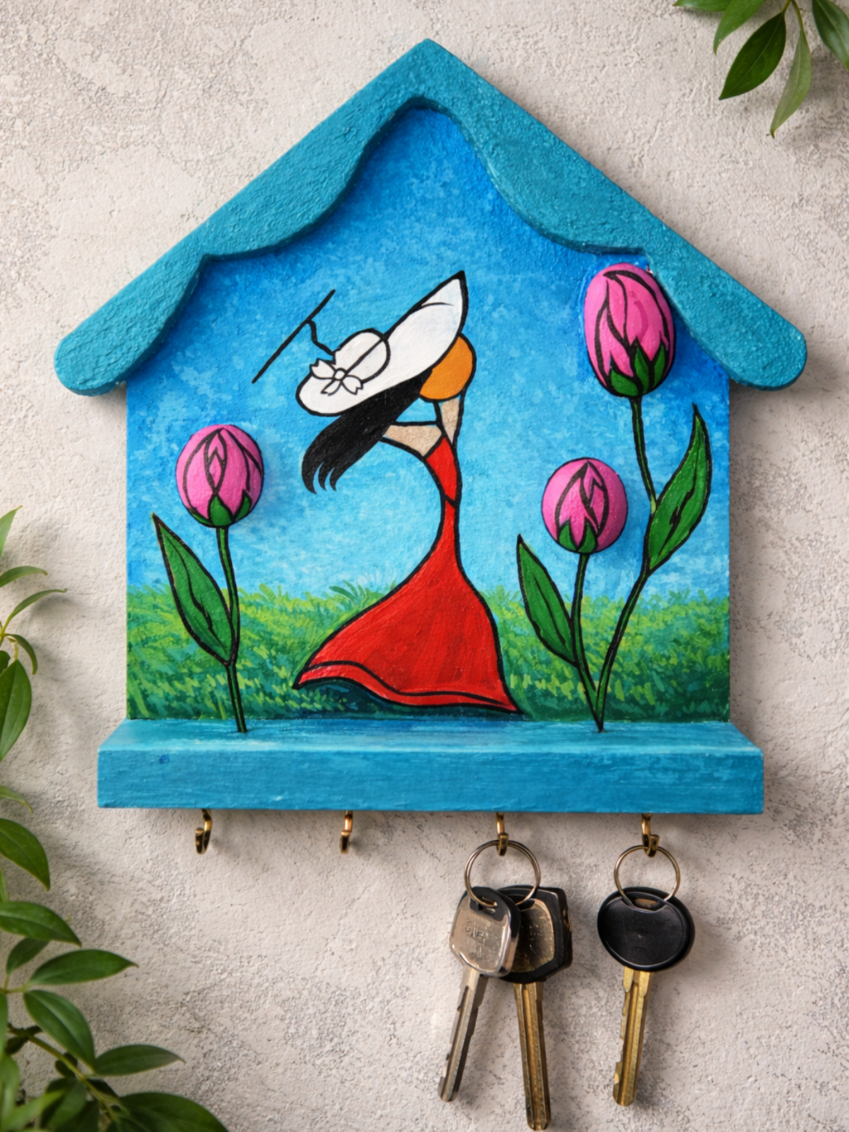 Akrilik boya ile tamamen el boyaması olarak hazırlanan bu özel MDF anahtarlık askısı, zarif bir kadın silüeti ve lale motifleriyle yaşam alanlarınıza sanatsal bir dokunuş katar. Canlı renkleri, dokulu boyama tekniği ve özgün tasarımıyla her biri tek ve eşsizdir.