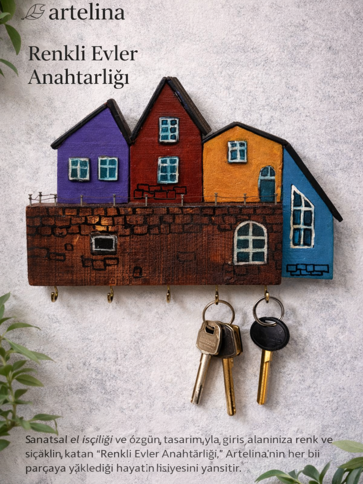 Doğal palet tahtası üzerine akrilik boya ile elde şekillenen Renkli Evler Anahtarlığı, Artelina’nın el emeğine ve hikâyesi olan tasarımlara verdiği değeri yansıtır. Yan yana dizilen ev formları, birlikte yaşamı, sıcaklığı ve aidiyet duygusunu simgeler.
